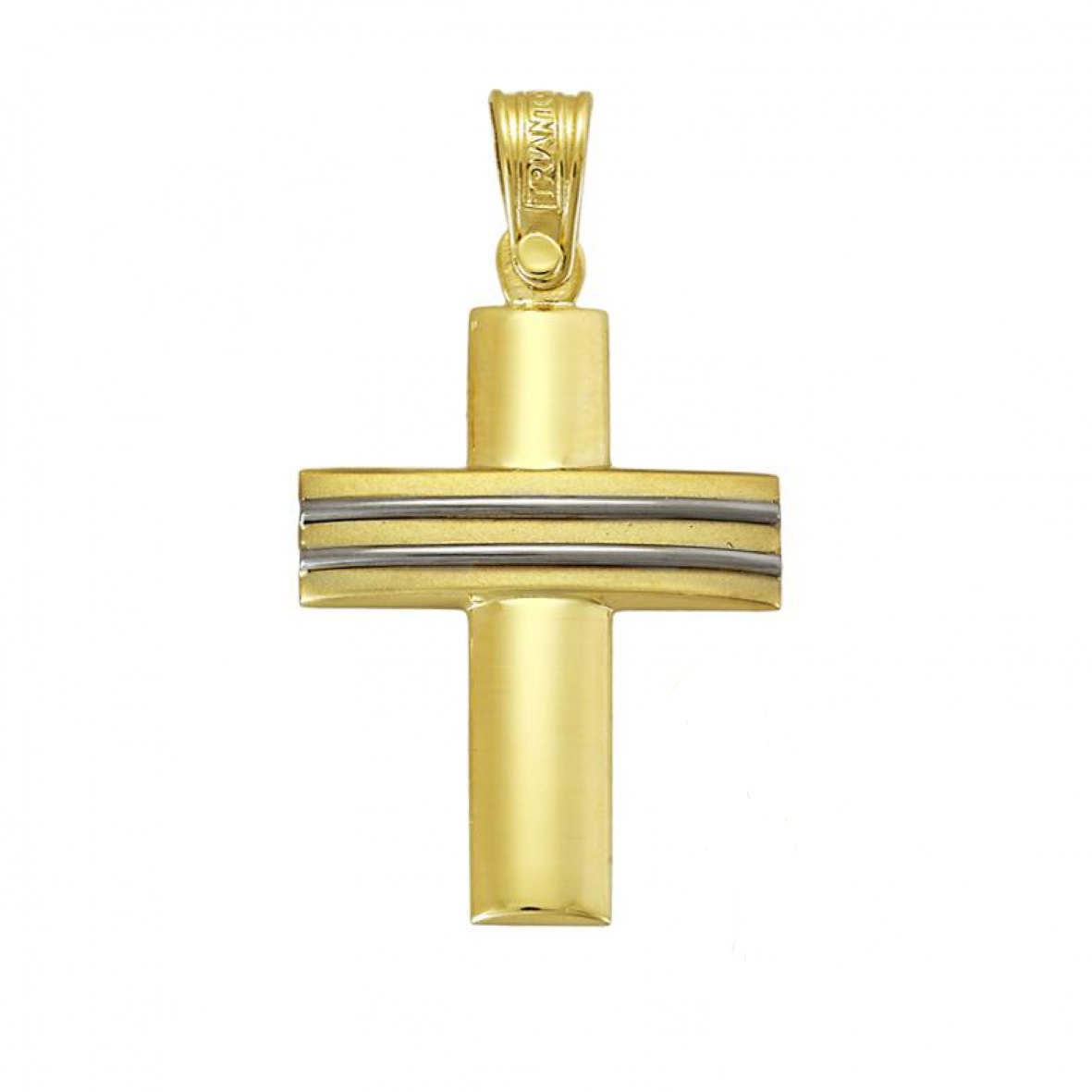 Ανδρικός σταυρός σε κίτρινο χρυσό 14 καρατίων με δύο λευκόχρυσες γραμμές της συλλογής TRIANTOS. Το βάρος του είναι 8,2 γραμμάρια και το μέγεθός του 3,5 εκατοστά. Ένας υπέροχος σταυρός με μοντέρνο σχέδιο που μπορείτε να τον φορέσετε όλες τις ώρες της ημέρας. Ταιριάζει με μια αλυσίδα σε κίτρινο χρυσό χρώμα. Ο σταυρός είναι ιδανικός και για τη βάπτιση ενός αγοριού.