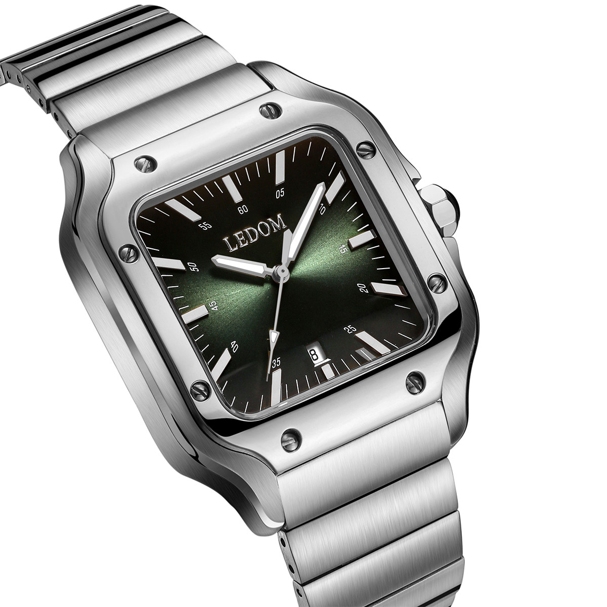 Ανδρικό ρολόι της σειράς LeDom Vanguard με ατσάλινο μπρασελέ σε ασημί χρώμα. Έχει ασημί κάσα και σκούρο πράσινο καντράν. Η διάμετρός του είναι 40 χιλιοστά και λειτουργεί με μηχανισμό μπαταρίας. Έχει ένδειξη ημερομηνίας. Είναι ανθεκτικό στην υγρασία, τη βροχή, τον ιδρώτα, το πλύσιμο των χεριών και σε εργασίες που σχετίζονται με το γλυφό νερό χωρίς πίεση (5 ΑΤΜ).