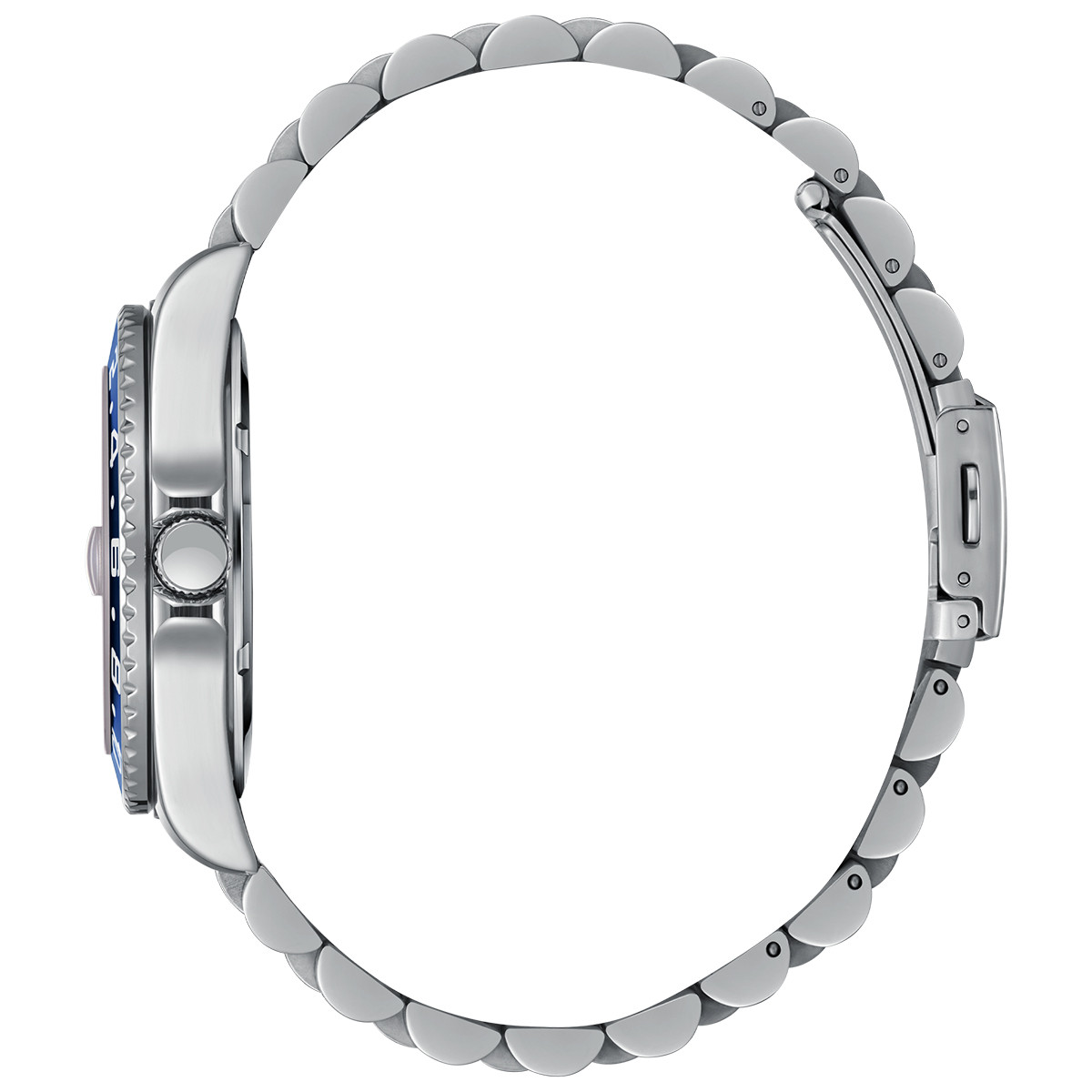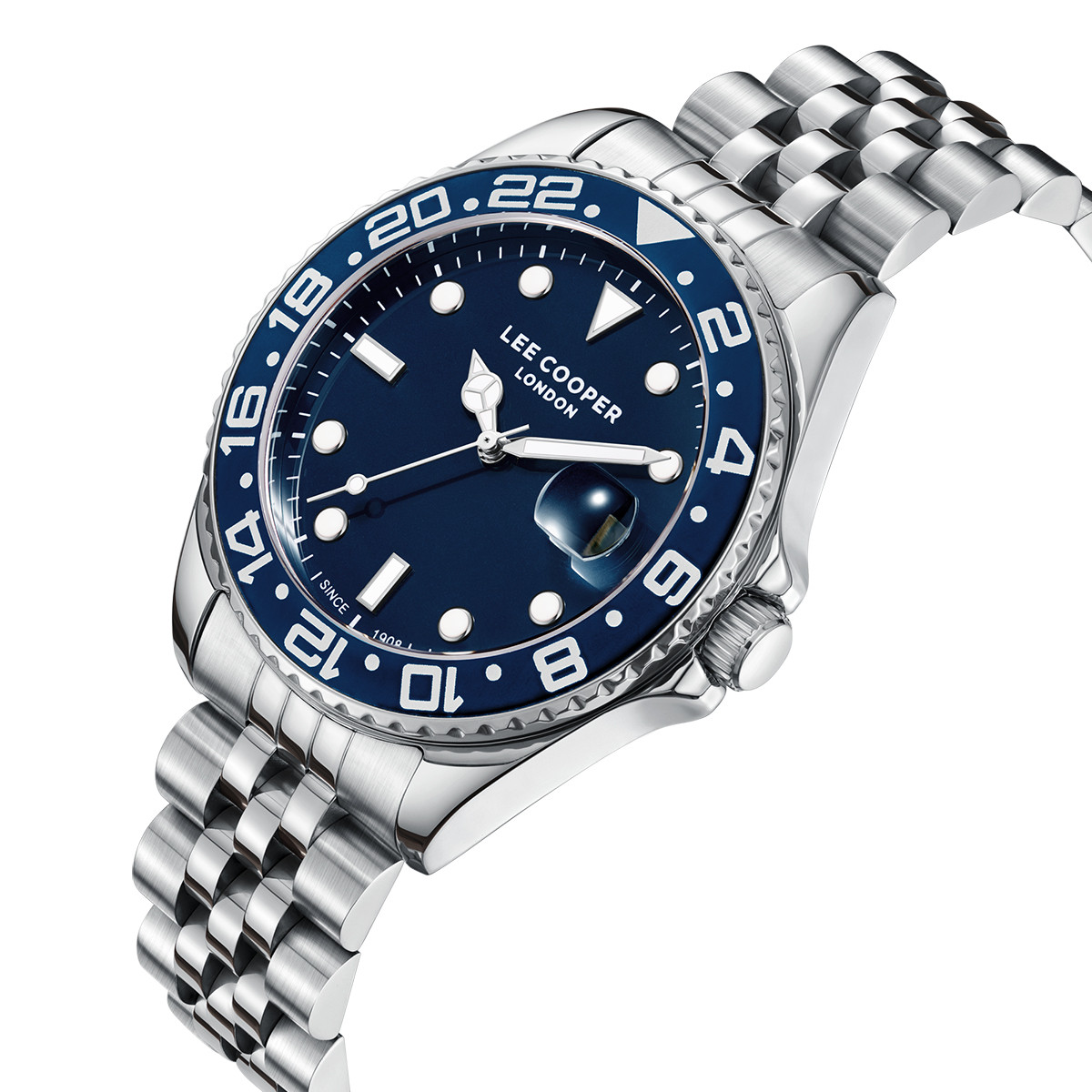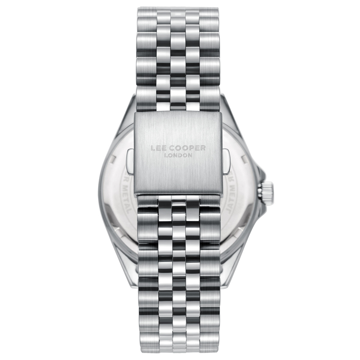 Αντρικό ρολόι Lee Cooper διαμέτρου 42mm με μηχανισμό Quartz. Έχει κάσα σε ασημί και καντράν σε σκούρο μπλε χρώμα. Το μπρασελέ του είναι ασημί, ενώ και οι δείκτες και οι λεπτομέρειες του είναι σε λευκό χρώμα. Το κρύσταλλο του είναι ορυκτό και το κούμπωμά του είναι ασφαλείας. Έχει λειτουργία ημερομηνίας. Είναι αδιάβροχο (5 ΑΤΜ). Είναι ένα μοντέρνο ρολόι για άντρες που επιλέγουν casual εμφανίσεις.