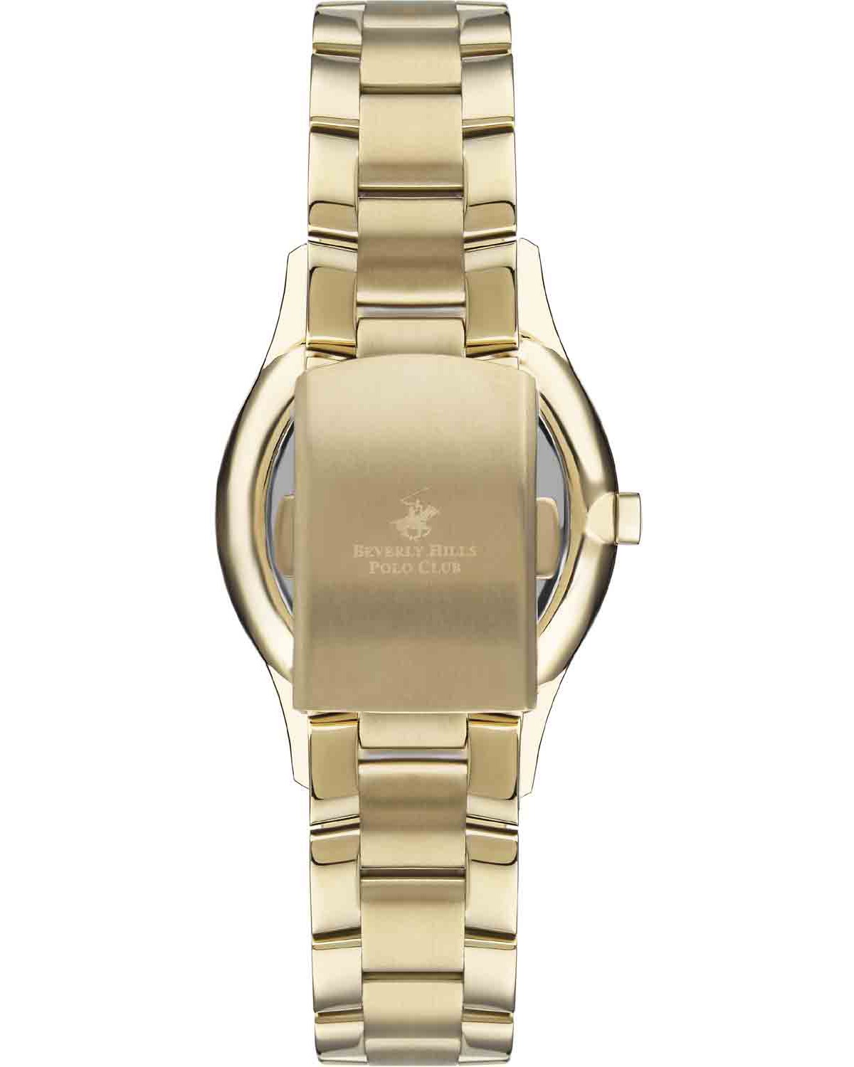 Γυναικείο ρολόι Beverly Hills Polo Club χρυσό ατσάλινο μπρασελέ και χρυσές λεπτομέρειες. Το καντράν του είναι σαμπανιζέ χρώμα με ιδιαίτερο σχέδιο. Διαθέτει μηχανισμό μπαταρίας, η διάμετρος της κάσας του είναι 35 χιλιοστά και η αντοχή του στο νερό 3 ατμόσφαιρες.