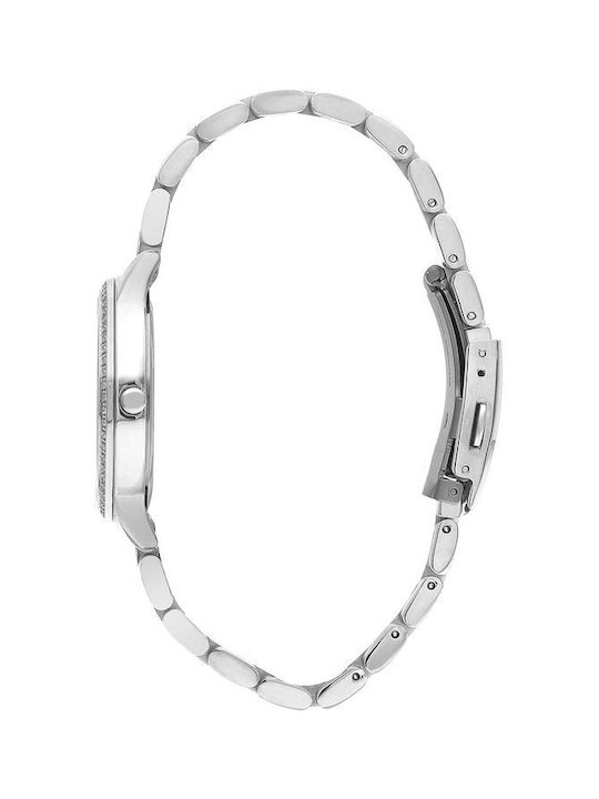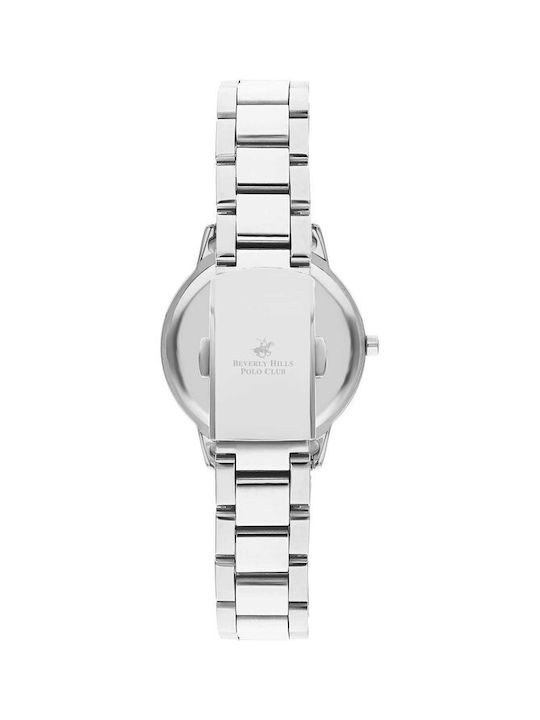 Γυναικείο ρολόι Beverly Hills Polo Club ασημί ατσάλινο μπρασελέ από ανοξείδωτο ατσάλι, ασημί λεπτομέρειες και μηχανισμό μπαταρίας. Το καντράν του είναι χρώμα mother of pearls με λευκά ζιργκόν αντί για νούμερα. Η κάσα του είναι ασημί με λευκά ζιργκόν γύρω της. Η διάμετρος της κάσας του είναι 35 χιλιοστά και η αντοχή του στο νερό 3 ατμόσφαιρες.