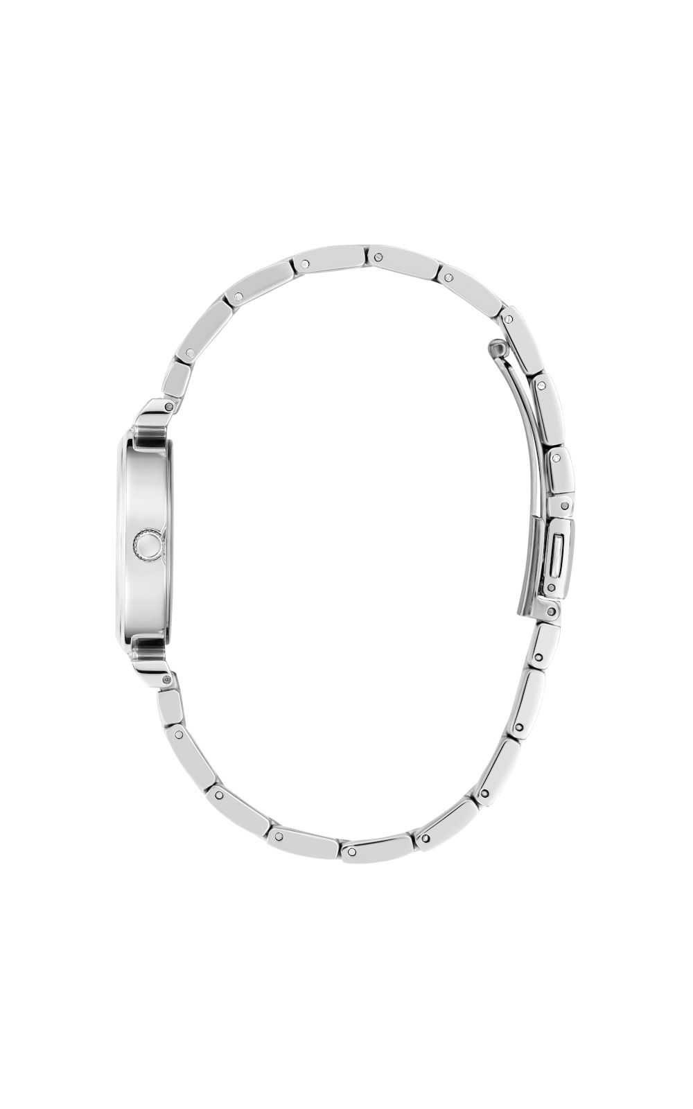 Γυναικείο ρολόι διαμέτρου 28mm με μηχανισμό QUARTZ ακριβείας. Έχει ασημένιο καντράν με διαφανείς πέτρες ζιργκόν και ασημί δείκτες. Η κάσα του είναι από ανακυκλωμένο ατσάλι με ασημένιες λεπτομέρειες.Έχει ασημένιο μπρασελέ και κούμπωμα ασφαλείας. Είναι αδιάβροχο (3 ΑΤΜ).