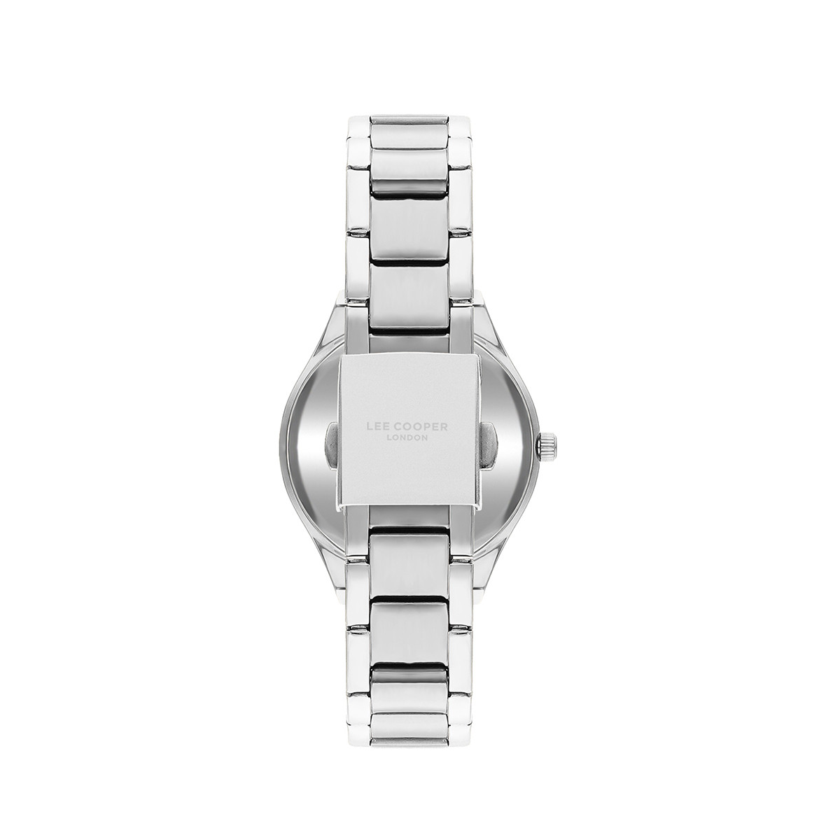 Γυναικείο ρολόι Lee Cooper διαμέτρου 32mm με μηχανισμό Quartz. Έχει κάσα σε ασημί και δίχρωμο καντράν σε μπλε-ασημί χρώμα. Το κρύσταλλο του είναι ορυκτό και το κούμπωμά του είναι ασφαλείας. Είναι αδιάβροχο σε τυχαία επαφή με το νερό (3 ΑΤΜ). Είναι ένα μοντέρνο ρολόι για γυναίκες που επιλέγουν casual εμφανίσεις.