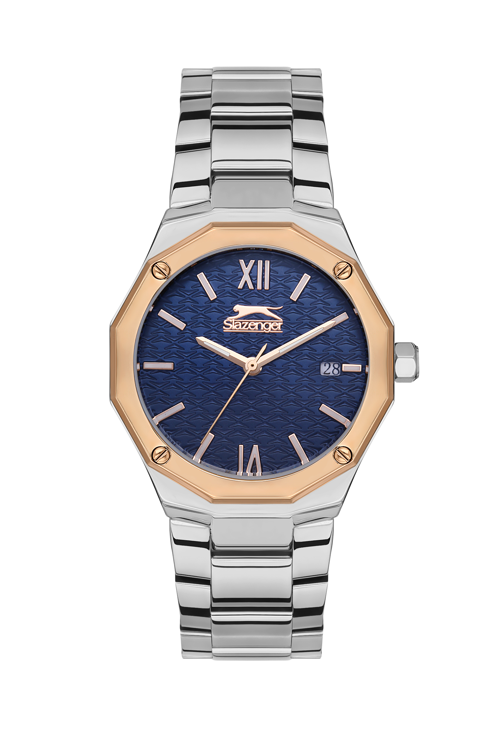 Γυναικείο ρολόι Slazenger διαμέτρου 34mm με μηχανισμό Quartz. Έχει κάσα σε ροζ χρυσό χρώμα από ανοξείδωτο ατσάλι και σκούρο μπλέ καντράν. Το κρύσταλλο του είναι ορυκτό, το μπρασελέ του είναι σε χρώμα ασημί και το κούμπωμά του είναι ασφαλείας. Είναι αδιάβροχο στις σταγόνες της βροχής και το πλύσιμο των χεριών (3 ΑΤΜ).