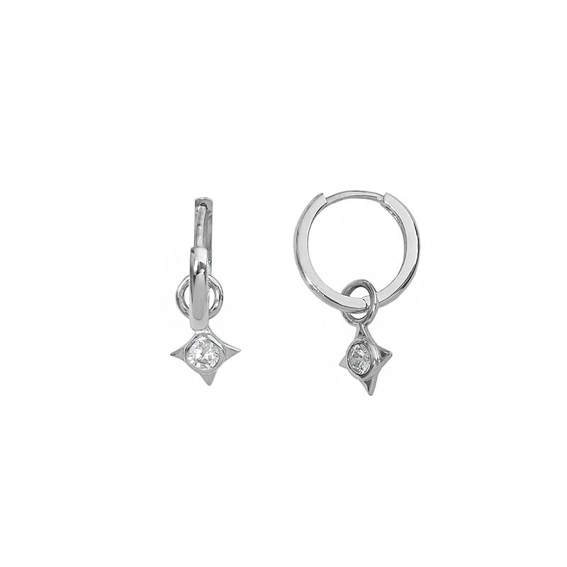 Λευκόχρυσα κρικάκια από χρυσό 14 καρατίων με ένα κρεμαστό αστεράκι με λευκή πέτρα ζιργκόν. Διακριτικά και μοντέρνα με βάρος μόλις 2 γραμμάρια, διάμετρο 1,3 εκατοστά και ύψος 2 εκατοστά. Είναι κατάλληλα για κάθε σας εμφάνιση και σε κάθε περίσταση. Μπορείτε να τα φορέσετε μόνα τους ή σε συνδυασμό με άλλα σκουλαρίκια όλες τις ώρες της ημέρας. Είναι κατάλληλα για μεγάλα και μικρά κορίτσια.