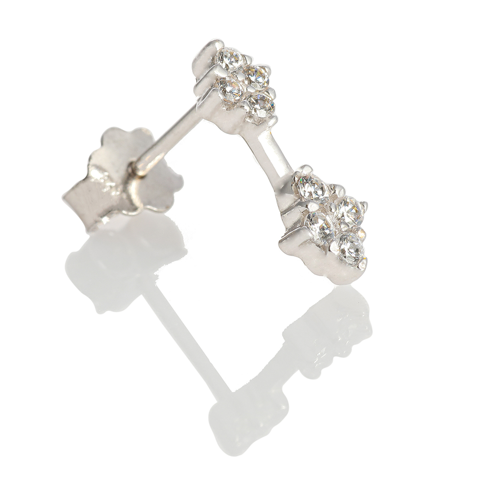 Καρφωτά σκουλαρίκια με δύο ρόμβους, ένα μικρότερο και ένα μεγαλύτερο σε λευκό χρυσό 14 καρατίων με πέτρες ζιργκόν. Το βάρος τους είναι 1,3 γραμμάρια και το μέγεθός τους 1,3 εκατοστά. Ένα απλό και καθημερινό ζευγάρι σκουλαρίκια με λάμψη που θα σας φωτίζει όλες τις ώρες της ημέρας.