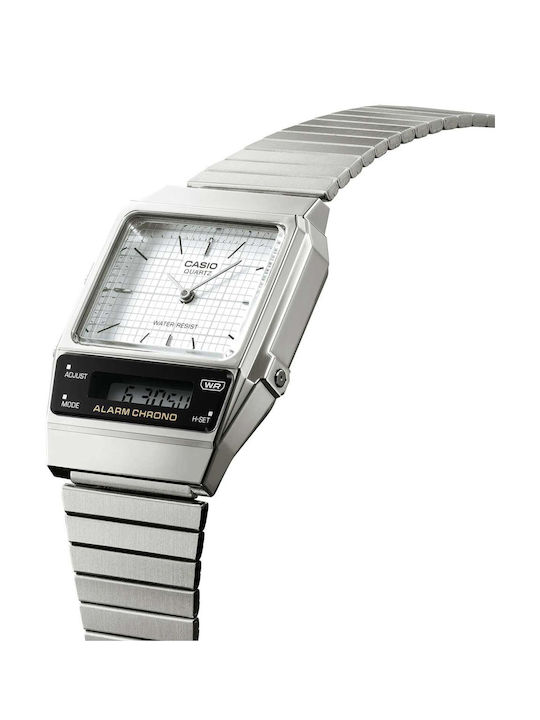 Ψηφιακό και αναλογικό ρολόι της σειράς Vintage της εταιρίας Casio Edgy σε μεσαίο μέγεθος με μπρασελέ από ανοξείδωτο ατσάλι σε ασημί χρώμα. Έχει μηχανισμό μπαταρίας και είναι ανθεκτικό σε ελάχιστη επαφή με το νερό (τυχαίες σταγόνες, 3 atm/30 μέτρα). Οι λειτουργίες του περιλαμβάνουν ημέρα, ημερομηνία, μήνα, 24ωρη ώρα, δεύτερη ζώνη ώρας, χρονόμετρο, αυτόματο ημερολόγιο και ξυπνητήρι. Ο σχεδιασμός του είναι διαχρονικός και μπορείτε εύκολα να το συνδυάσετε με κάθε στυλ. Είναι μια σύγχρονη εκδοχή των κλασικών ρολογιών της δεκαετίας του 70′, του 80′ και του 90′.
